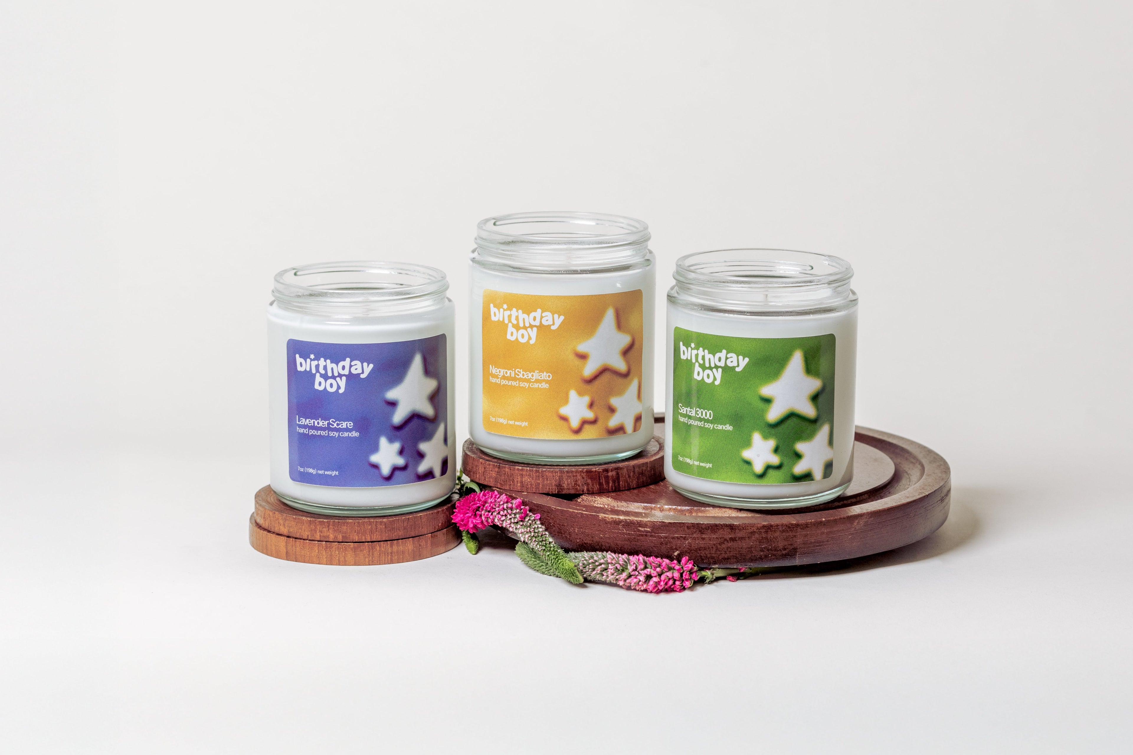 Every Birthday Boy candle is handmade with dye-free natural soy, phthalate-free fragrance oils infused with essential oils, and a cotton wick, all housed in a recycled glass jar. We're launching with three signature scents: Negroni Sbagliato, Lavender Scare, and Santal 3000. And if you can't decide or just want them all, get the Birthday Bundle.
